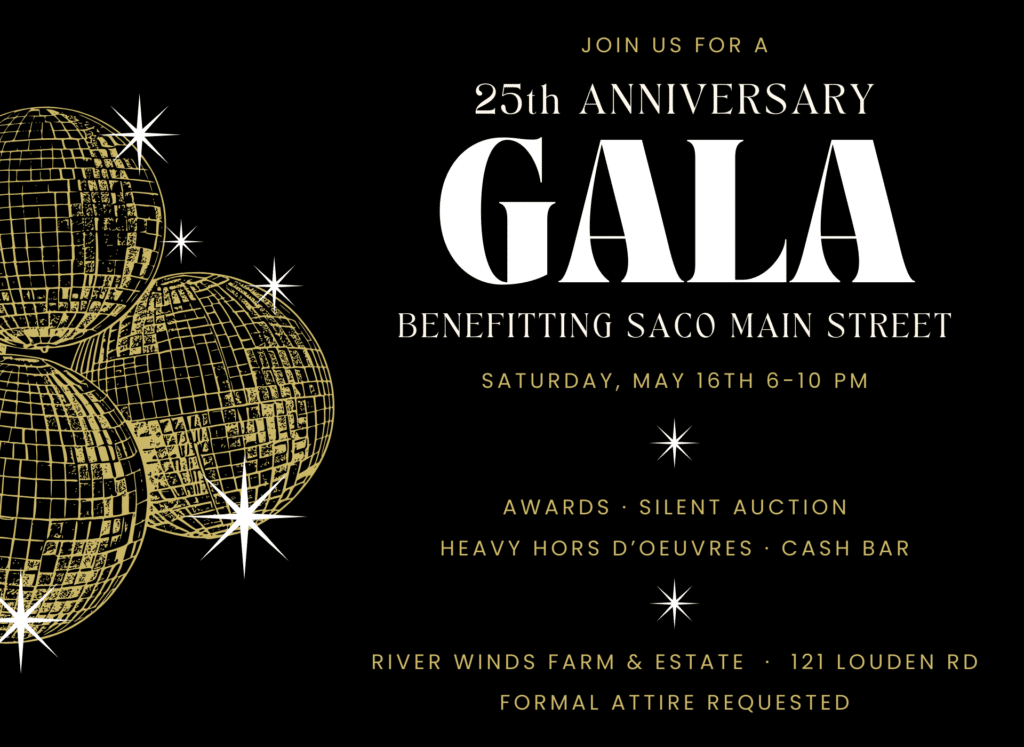 Join us as we celebrate 25 years of Saco Main Street! On Saturday, May 16, we invite you to an elegant evening at the stunning River Winds Farm & Estate in Saco for our 25th Anniversary Gala. This milestone celebration will bring together community members, local business owners, and longtime supporters for a night to remember.
